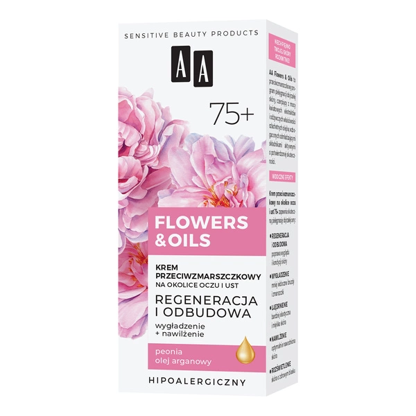 AA Flowers & Oils 75+ - Przeciwzmarszczkowy krem regenerująco-odbudowujący pod oczy i na okolice ust, 15 ml.