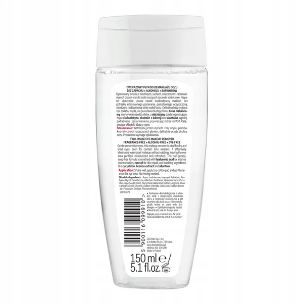 Dwufazowy płyn do demakijażu oczu został stworzony z myślą o pielęgnacji wrażliwej, suchej, zmęczonej i zaczerwienionej skóry wokół oczu. Jest to również idealne rozwiązanie dla osób noszących soczewki kontaktowe.