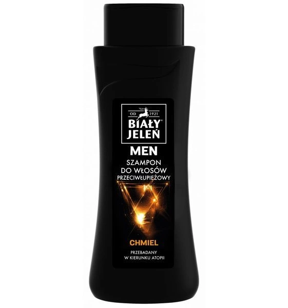 Hipoalergiczny szampon do włosów premium men Chmiel BIAŁY JELEŃ sprawdzi się osobom ze skórą wrażliwą oraz nadmiernie przetłuszczającymi się i skłonnymi do łupieżu włosami. Wystarczy nałożyć na wilgotne włosy, delikatnie masować do powstania piany i spłukać. Szampon przebadany dermatologicznie wśród osób ze skłonnością do alergii skórnych. Dzięki systematycznemu stosowaniu pozbędziesz się łupieżu na dobre!