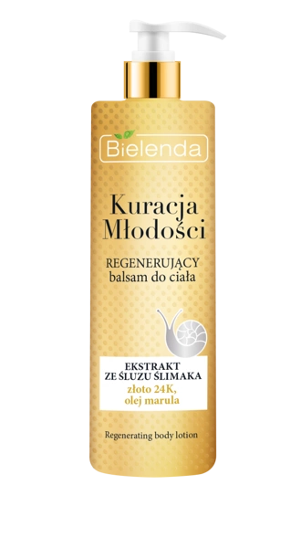 Kuracja Młodości to linia kosmetyków dedykowana skórze dojrzałej. W niej znajduje się cudowny Regenerujący balsam do ciała. Kosmetyk to prawdziwe bogactwo składników aktywnych. Znajdziesz w nim nie tylko ekstrakt ze śluzu ślimaka ale również olej z opuncji figowej oraz 24K złota. Wszystko to sprawia, że balsam doskonale nawilża skórę, ujędrnia ją oraz kompleksowo wygładza.