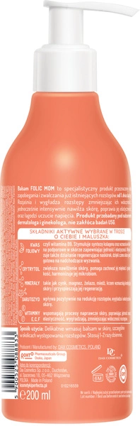Balsam FOLIC MOM to specjalistyczna formuła, która pomaga zapobiegać powstawaniu rozstępów oraz zwalczać te już istniejące. Można go bezpiecznie stosować już od pierwszego dnia ciąży. Jego działanie polega na rozjaśnianiu i wygładzaniu istniejących zmian, co sprawia, że stają się mniej widoczne. Dodatkowo, balsam głęboko nawilża, uelastycznia skórę i przynosi ulgę w uczuciu napięcia. Kosmetyk został przetestowany pod kontrolą dermatologiczną i ginekologiczną, a jego formuła nie wpływa na wyniki badań USG.