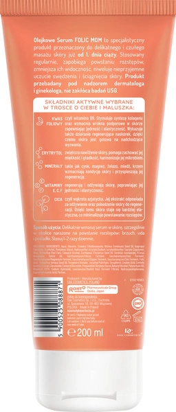 Olejkowe serum Folic Mom to specjalistyczny kosmetyk stworzony z myślą o delikatnym masażu skóry, bezpieczny do stosowania już od pierwszego dnia ciąży. Regularne używanie serum pomaga zapobiegać rozstępom, redukuje widoczność już istniejących, a także łagodzi uczucie swędzenia i napięcia skóry. Formuła została przetestowana pod kontrolą dermatologiczną i ginekologiczną oraz nie wpływa na wyniki badań USG.