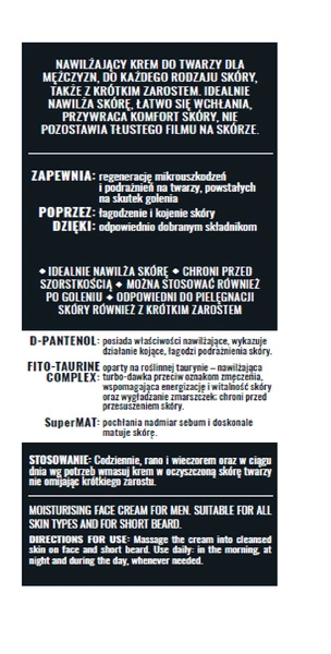 Krem nawilżający stworzony dla mężczyzn, odpowiedni dla każdego typu cery, również do pielęgnacji skóry z zarostem. Jego lekka formuła szybko się wchłania, intensywnie nawilżając i przywracając komfort bez pozostawiania tłustej warstwy. Produkt skutecznie regeneruje mikrouszkodzenia i łagodzi podrażnienia, które mogą powstać podczas golenia. Chroni skórę przed szorstkością i może być stosowany także jako kosmetyk po goleniu.