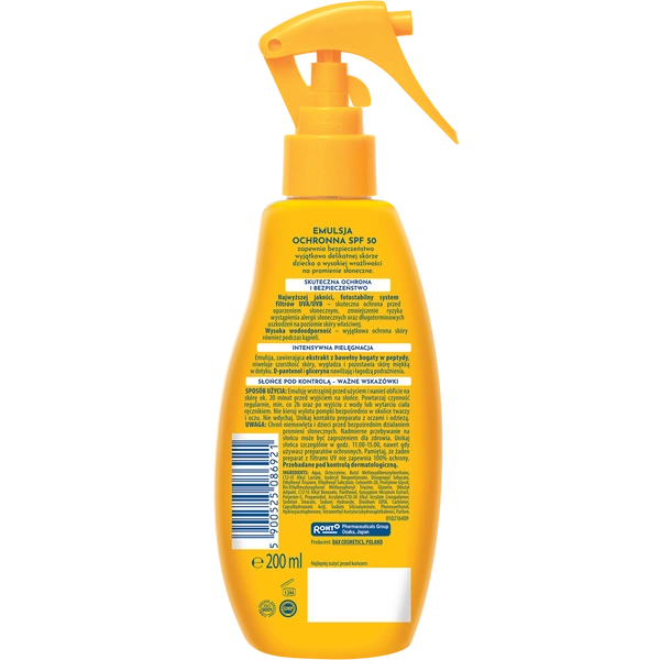 • Emulsja ochronna SPF 50 zapewnia bezpieczeństwo delikatnej skórze dziecka o wysokiej wrażliwości na promienie słoneczne. Emulsja, zawiera ekstrakt z bawełny bogaty w peptydy, niweluje szorstkość skóry, wygładza i pozostawia skórę miękka w dotyku.