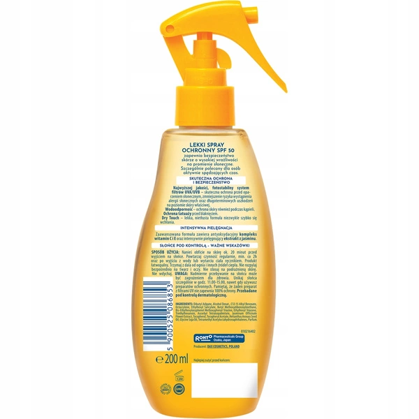 - Spray ochronny SPF 50 zapewnia bezpieczeństwo skórze o wysokiej wrażliwości na promienie słoneczne. Szczególnie polecany dla osób aktywnie spędzających czas. Wyjątkowa ochrona skóry również podczas kąpieli, ochrona tatuaży przed blaknięciem.