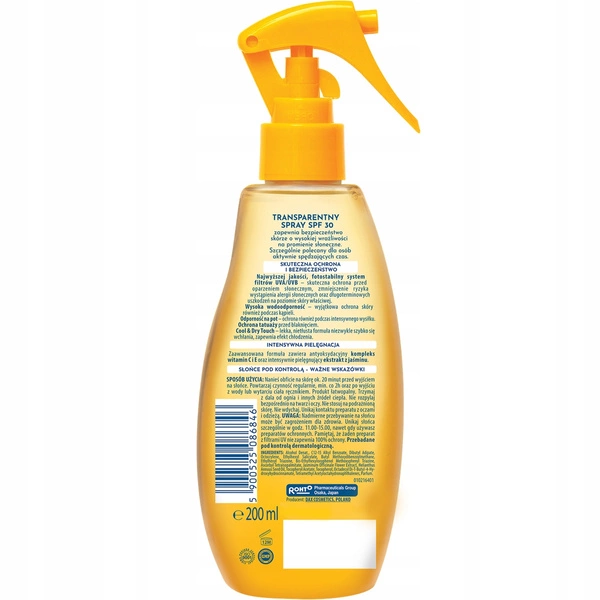 - Spray ochronny SPF 30 zapewnia bezpieczeństwo skórze o wyjątkowej wrażliwości na promienie słoneczne. Szczególnie polecany dla osób aktywnie spędzających czas. Wyjątkowa ochrona skóry również podczas kąpieli, ochrona tatuaży przed blaknięciem.