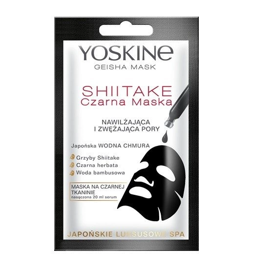 - Maska w płachcie, na czarnej tkaninie. Nawilżająca i zwężająca pory. Nasączona 20 ml serum, bogatego w składniki inspirowane japońską sztuką pielęgnacji skóry