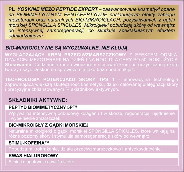 YOSKINE MEZO PEPTIDE EXPERT to zaawansowana linia kosmetyków, której formuła bazuje na biomimetycznym pentapeptydzie. Jego działanie inspirowane jest zabiegami mezoterapii. Dodatkowo, w składzie znajdują się naturalne bio-mikroigły pozyskiwane z gąbki morskiej Spongilla Spicules. Stymulują one skórę od wewnątrz do głębokiej samoodnowy, co zapewnia widoczny efekt odmłodzenia. Produkty wykorzystują innowacyjną technologię IN-YO.