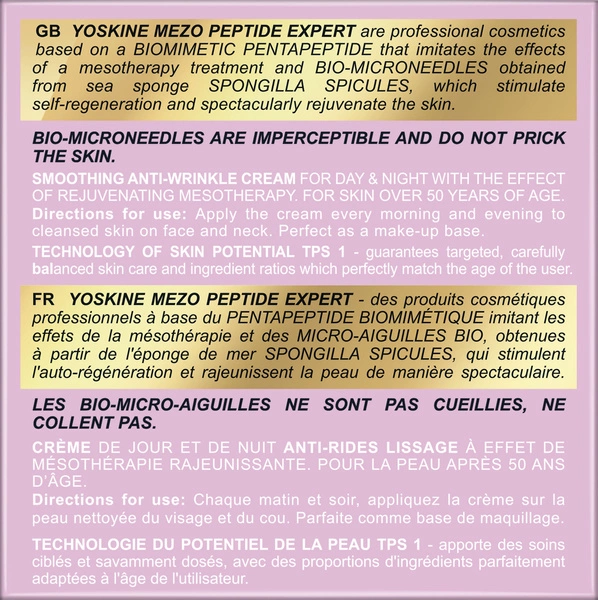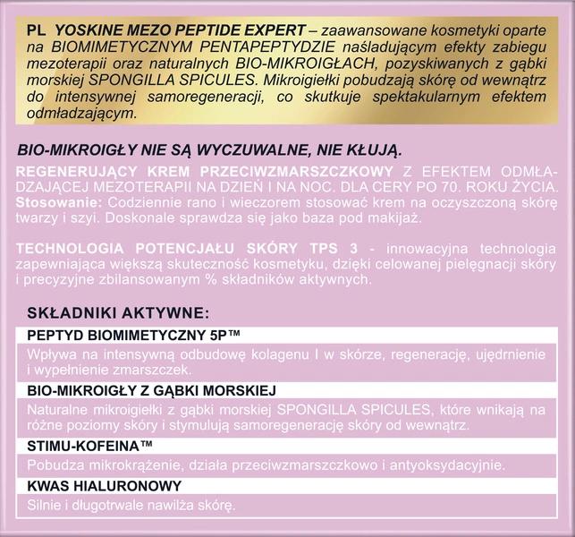 YOSKINE MEZO PEPTIDE EXPERT to linia zaawansowanych kosmetyków, których formuła bazuje na biomimetycznym pentapeptydzie, imitującym rezultaty profesjonalnej mezoterapii. Skład wzbogacono o naturalne bio-mikroigły, które pozyskiwane są z gąbki morskiej Spongilla Spicules. Te mikrocząsteczki stymulują skórę od wewnątrz do głębokiej samoodnowy, co przynosi widoczne efekty odmładzające. W produktach zastosowano innowacyjną technologię IN-YO.