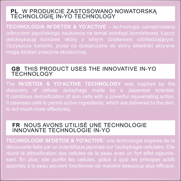 Inspiracją dla tej technologii było japońskie odkrycie naukowe dotyczące autofagii komórkowej. Łączy ona proces detoksykacji komórek skóry z intensywnym działaniem odmładzającym. Dzięki oczyszczeniu komórek, składniki aktywne dostarczane skórze mogą działać znacznie efektywniej. Bio-mikroigły są niewyczuwalne i nie powodują uczucia kłucia.