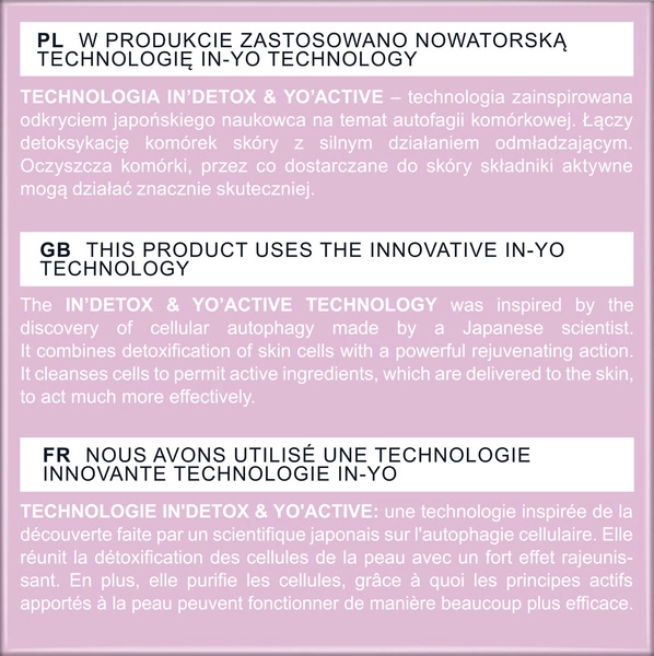 TECHNOLOGIA IN’DETOX & YO’ACTIVE, inspirowana japońskim odkryciem dotyczącym autofagii komórek, łączy w sobie detoksykację komórkową z intensywnym działaniem przeciwstarzeniowym. Dzięki oczyszczeniu komórek, składniki aktywne zawarte w kosmetyku mogą wnikać głębiej i działać efektywniej. Jest to ujędrniający krem przeciwzmarszczkowy na dzień i na noc dla cery 60+. Ważne: BIO-MIKROIGŁY są niewyczuwalne i nie powodują uczucia kłucia.