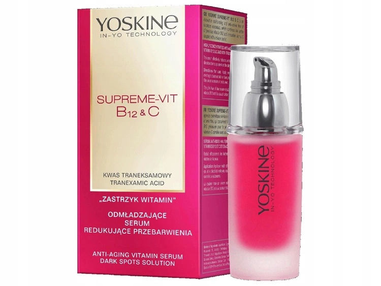 - Wysoce skoncentrowane, odmładzające serum redukujące przebarwienia. „Zastrzyk witamin” B12 & C z kwasem traneksamowym. Działa przeciwzmarszczkowo, redukuje plamy oraz przebarwienia widoczne na skórze. Różowy kolor kremu wynika z barwy witaminy B12.