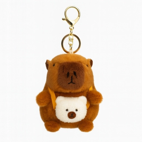 - Brelok do kluczy z przywieszką, pluszowa piszcząca Kapibara z torebką. Idealny jako ozdoba do kluczy lub torebki. Szerokość: 9cm. Wysokość: 11cm. Długość smyczy: 7cm. Długość całkowita: 18cm.