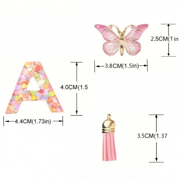 - Długość literki: 3,8cm Szerokość literki: 4,2cm Wymiary motylka: 3,8cm x 2,5cm Długość przywieszki z frędzelkami: 3,5cm Długość karabińczyka: 6,5cm.