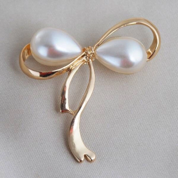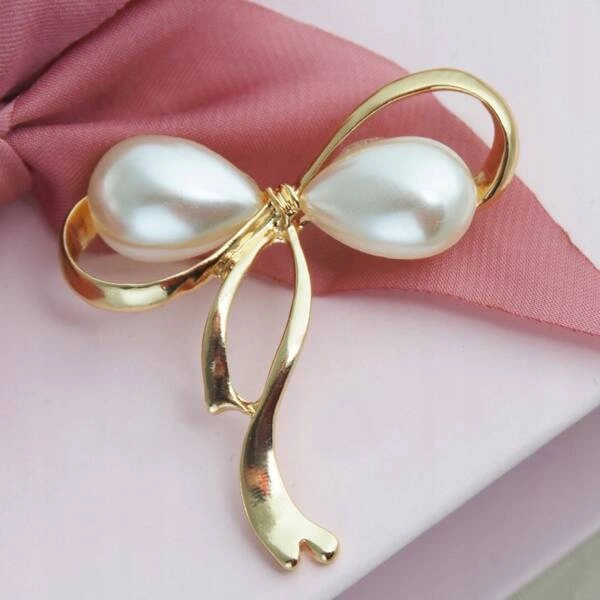 - Broszka kokarda z dwoma perłami. Pasuje do eleganckich, jak również do codziennych stylizacji. Elegancki dodatek na każdą okazję, do sukienek, swetrów i bluzek. Wykonana ze stopu metali nieszlachetnych bez niklu i chromu. Wymiary: 5,1x 4,8cm. Waga: 9g.
