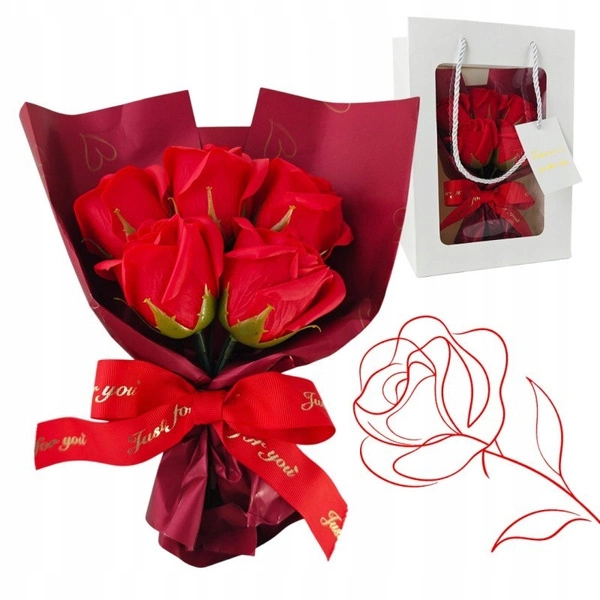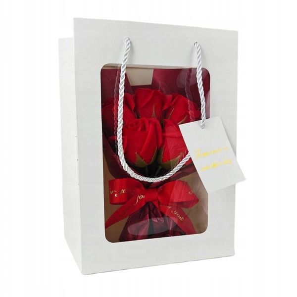 - Bukiet kwiatów zapachowych kwiatów mydlanych w ozdobnym pudełku. Każda róża mydlana jest starannie wykonana, aby oddać piękno prawdziwego kwiatu. Materiał: kwiaty mydlane / opakowanie z tworzywa sztucznego. Wymiary bukietu: 25cm x 14cm x 7cm