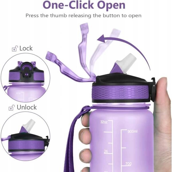 - Pojemność 1000ml średnica 7,5cm, wysokość 28cm. Materiał: PC + PP + silikon. Silikonowa dysza butelki na wodę jest połączona z odłączaną słomką. Posiada blokadę zabezpieczającą przed otwarciem klapki i rozlaniem płynu. Nie płukać we wrzątku.