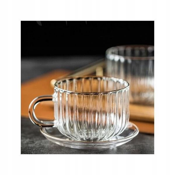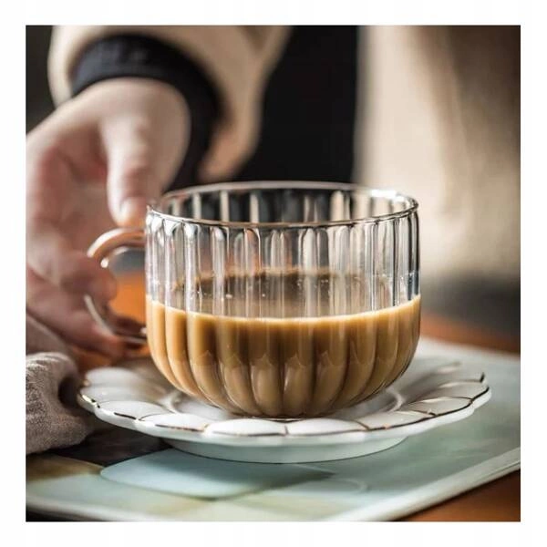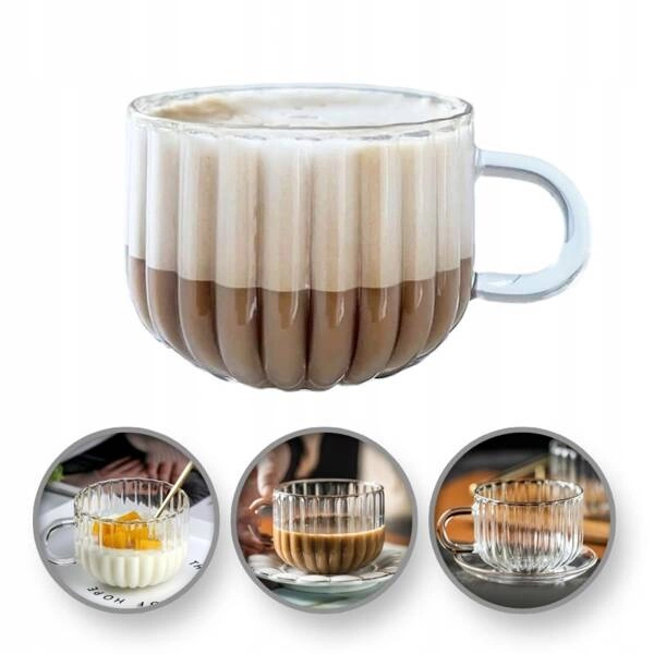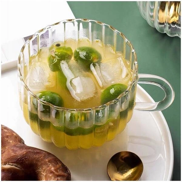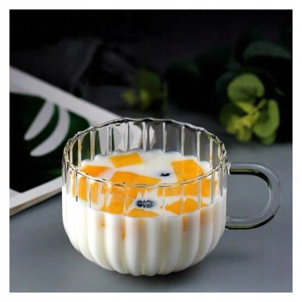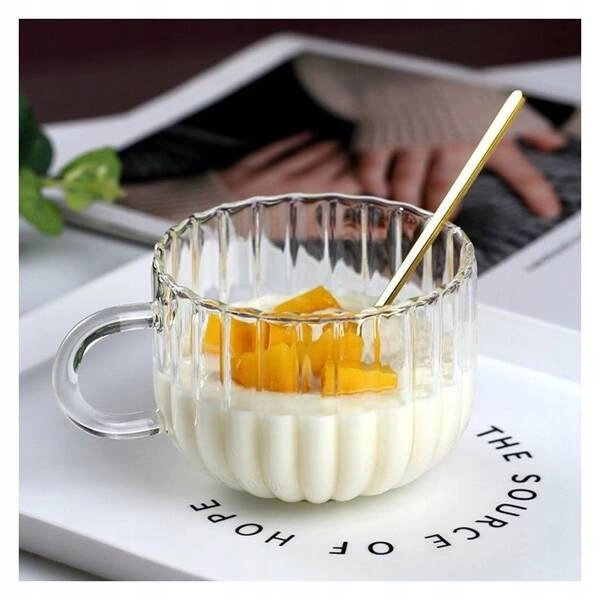 - Szklanka z falowanymi ściankami Ryflowana z uchem 450ml. Wykonane ze szkła boro- krzemowego, dzięki czemu są odporne na uszkodzenia oraz zarysowania. Myć ręcznie. Wysokość 7,5cm. Średnica wewnętrzna od góry 10cm.