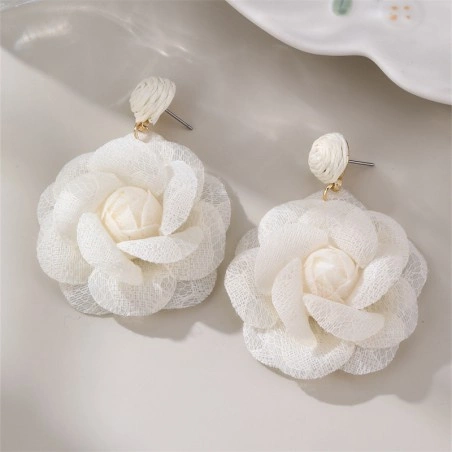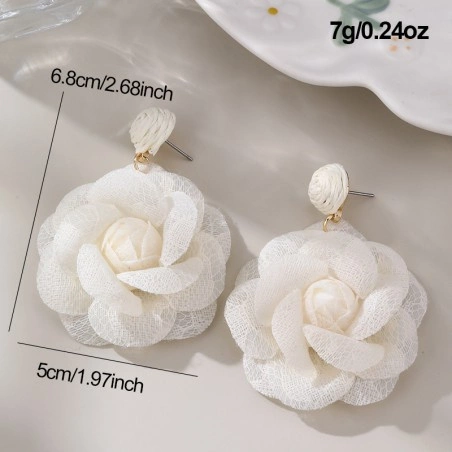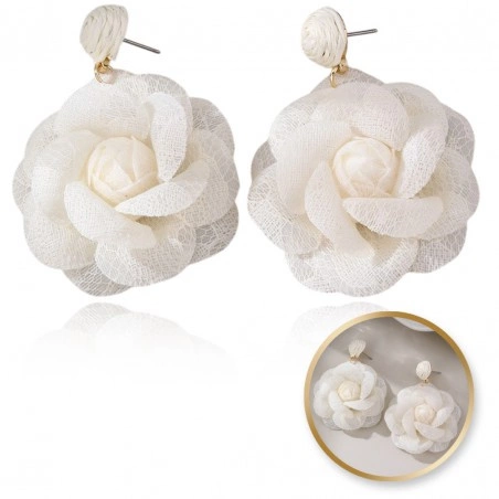 - Kolczyki sztuczne tiulowe kwiaty Będą stanowić piękne uzupełnienie eleganckiej kreacji jak i codziennego stroju. Zapięcie: sztyft, Wymiary: 6,5cm x 5 cm x 1,5cm. Biżuteria antyalergiczna, nie zawiera niklu ani chromu.