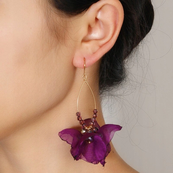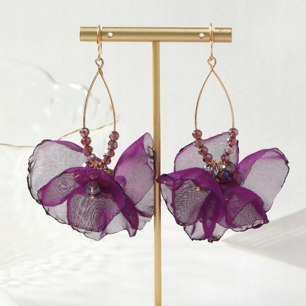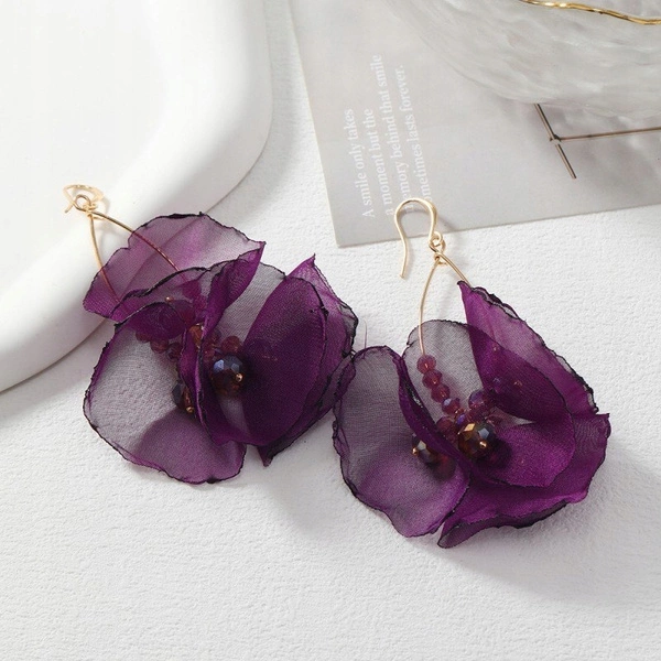 - Kolczyki wiszące, efektowne tiulowe kwiat. Będą stanowić piękne uzupełnienie eleganckiej kreacji jak i codziennego stroju. Biżuteria antyalergiczna, nie zawiera niklu ani chromu. Rodzaj zapięcia: bigiel. Wymiary: 8x 5cm