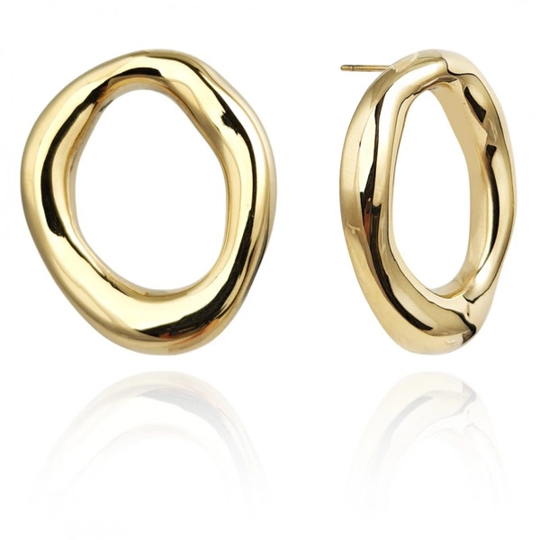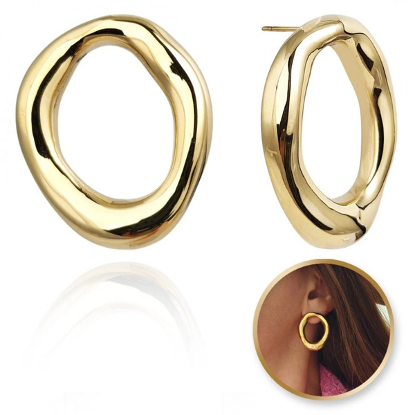 - Eleganckie kolczyki ze stali chirurgicznej platerowanej 14 karatowym złotem, która jest odporna na warunki atmosferyczne, nie ulega korozji, nie rdzewieje, nie śniedzieje. Rodzaj zapięcia: sztyft. Wymiary: 3,3cm x 2,8cm x 0,5cm