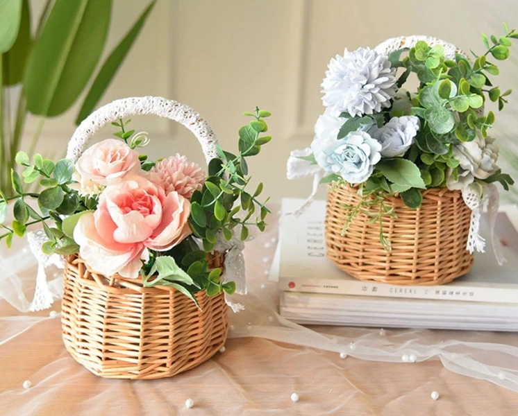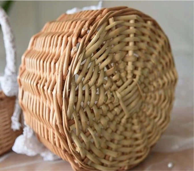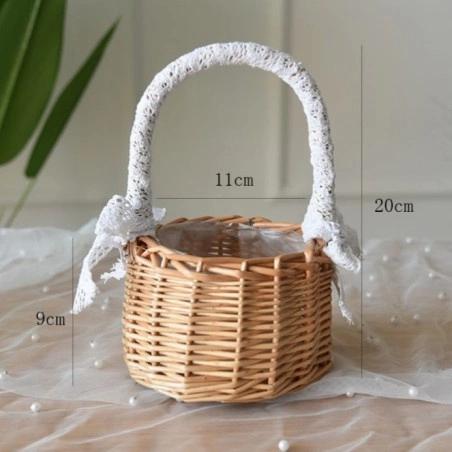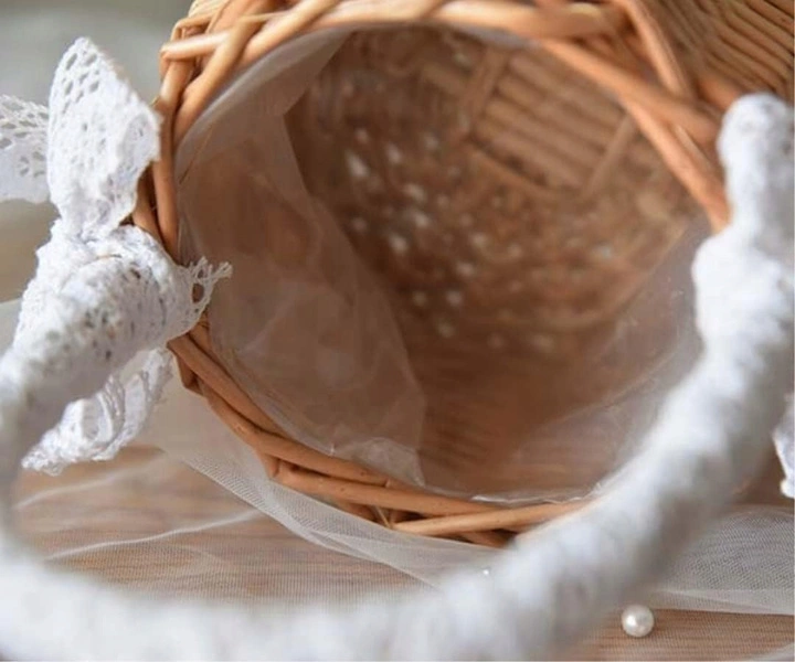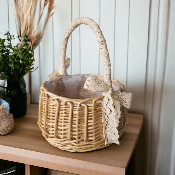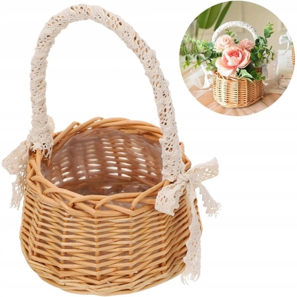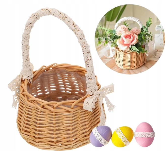 - Ręcznie wyplatany koszyczek wiklinowy z uchwytem owiniętym wstążką. Od wewnątrz zabezpieczony folią. Bardzo praktyczny koszyczek na święconkę, kwiaty lub do przechowywania np. owoców.