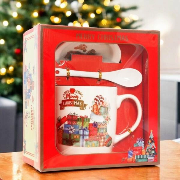 - Kubek ceramiczny z motywem świątecznym ze spodkiem i łyżeczką. Produkt przeznaczony do ręcznego mycia. Zestawu zapakowany w ozdobne kartonowe pudełko. Wymiary opakowania: 18x 16,5x 10cm.
