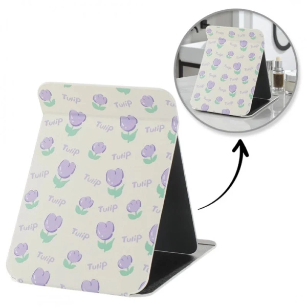 - Lusterko z delikatnym, kwiatowym wzorem tulipanów. Lusterko kosmetyczne w ekoskórze, otwierane, strojące, Posiada zawias pozwalający na ustalenie kąta lusterka. Wymiary: Lusterko: 20cm x 14cm, Całość: 20cm x 15,3cm