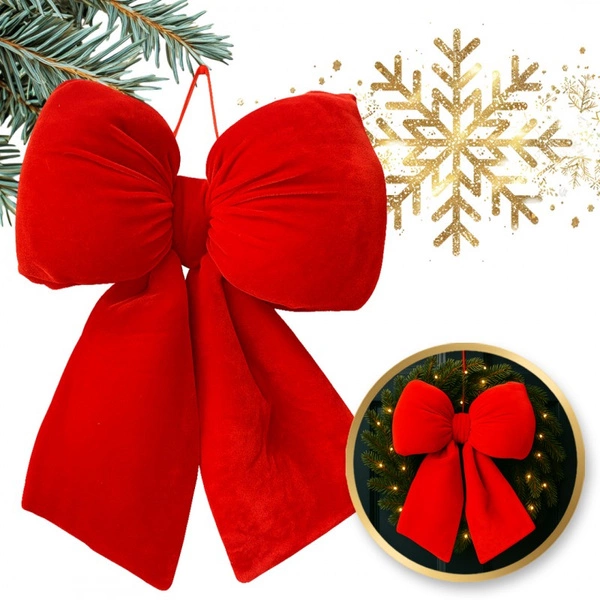 - Ta urocza dekoracja wprowadzi wyjątkowy akcent do każdego pomieszczenia. Jest trwała i zachowuje swój kształt, dzięki czemu będzie cieszyć oko przez cały sezon świąteczny. Wymiary: Długość sznurka: 9cm, Wymiary kokardy: 29cm x 33cm x 6cm