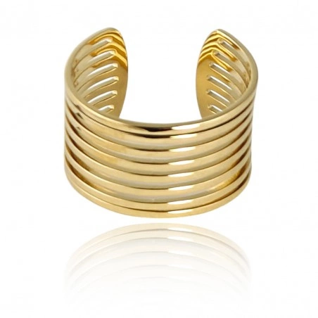 • Pierścionek platerowany 14-karatowym złotem. Wykonany ze stali nierdzewnej odpornej na warunki atmosferyczne, nie ulega korozji, nie rdzewieje, nie śniedzieje. Rozmiar: uniwersalny, regulowany. Szerokość: 2cm.