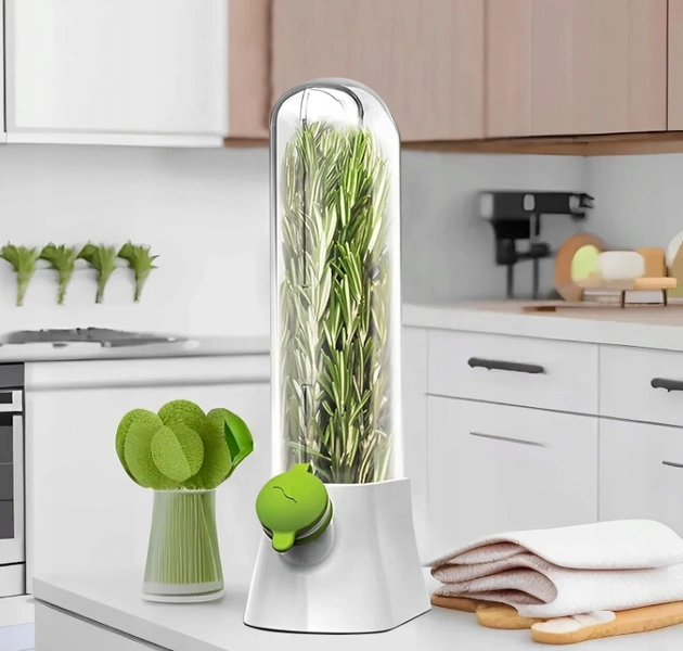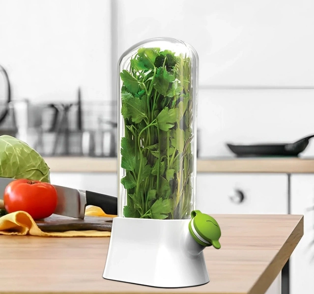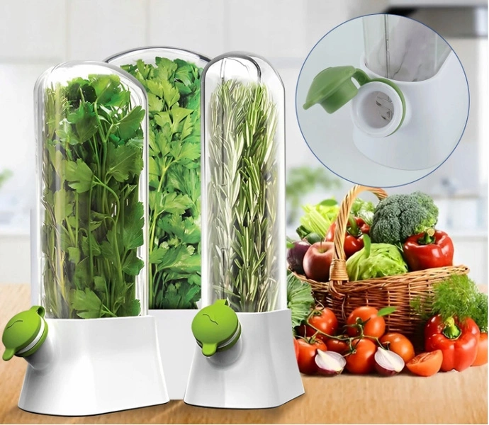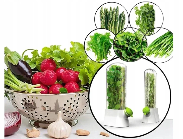 - Pojemnik ma dobrą wodoszczelność, pomaga utrzymać odpowiednią wilgotność ziół i warzyw przedłużając ich świeżość. Pojemnik wielokrotnego użycia. Wymiary: Wysokość 27cm, Szerokość podstawy 13cm, Szerokość 10cm,Głębokość 4,5cm