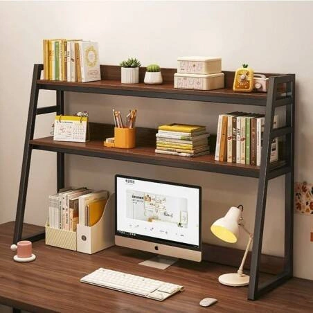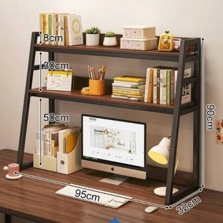 - Wielofunkcyjny regał o wymiarach 95x32x90, nadstawka na biurko. Środkowy blat zamocowany na wysokości 50 cm, dzięki czemu pod nim zmieści się nawet spory monitor. Blaty w kolorze ciemnego orzecha, metalowa czarna rama. Wysokości półek: 30 i 50cm.