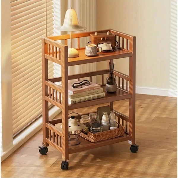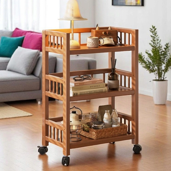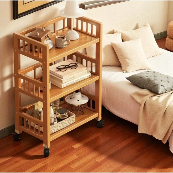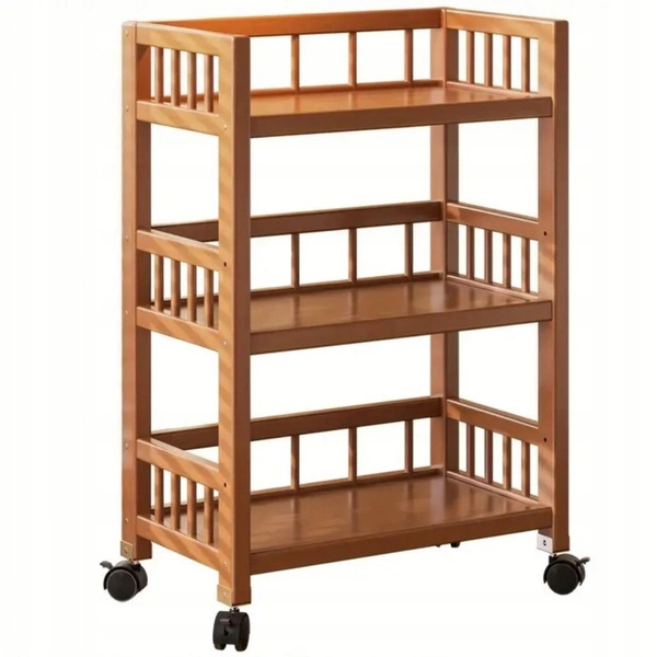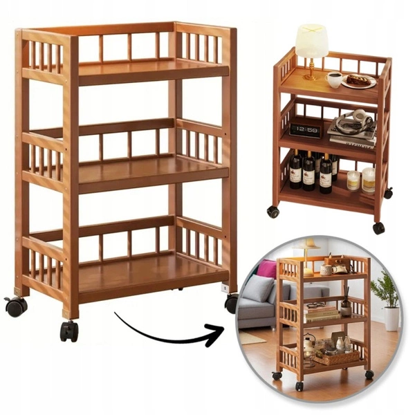 - Regał bambusowy na kółkach. Pojemne półki pomieszczą drobne i średnie akcesoria, przedmioty oraz ubrania. Solidny bambusowy stelaż. Trzy poziomy półek. Wymiary: wysokość: 82 cm, szerokość: 50 cm, głębokość: 30 cm