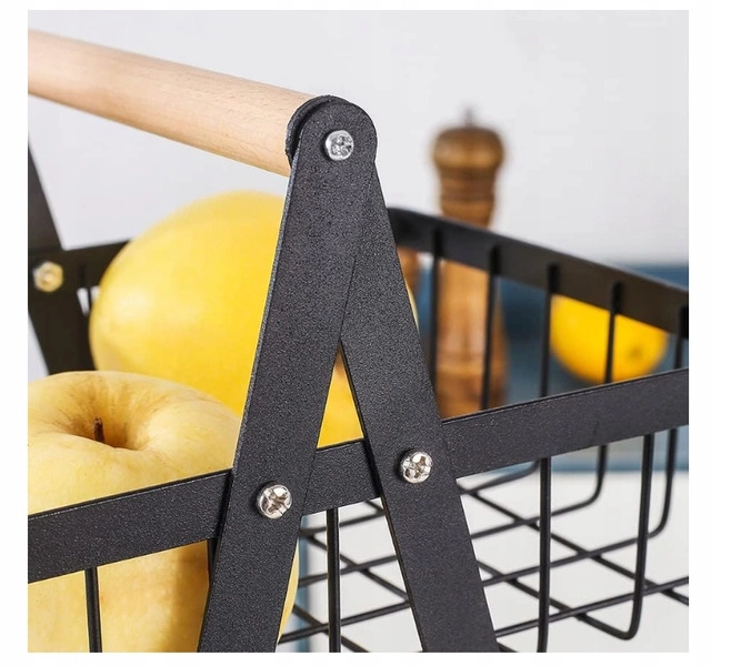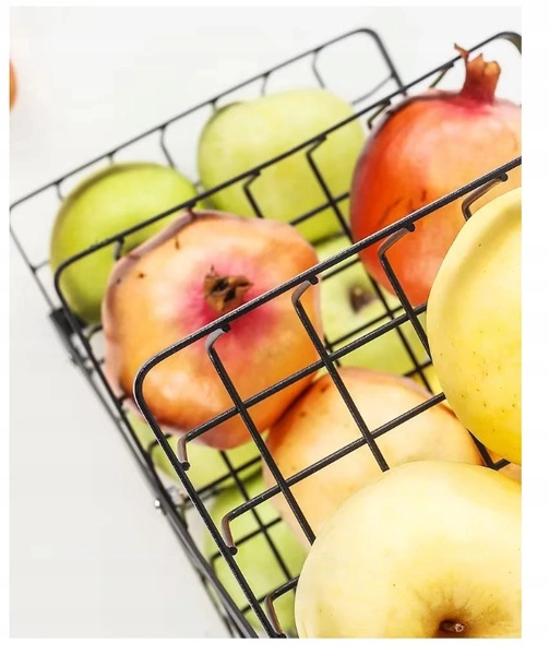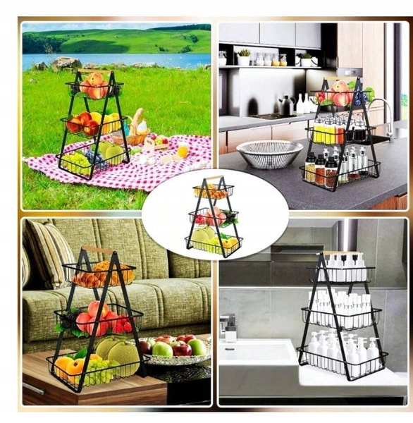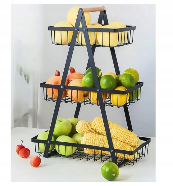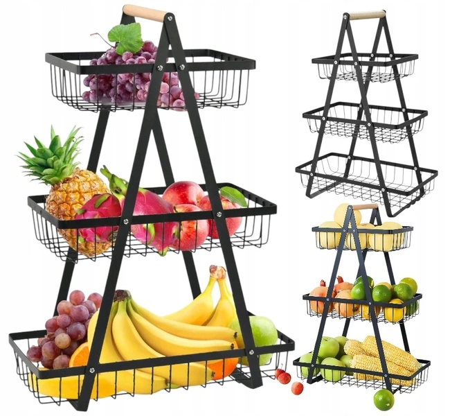 - Trzypoziomowy regał, koszyk na owoce i warzywa. Można przechowywać w nich rzeczy kuchenne, łazienkowe, a także drobne akcesoria. Lekka i wytrzymała konstrukcja w czarnym kolorze, zajmuje mało miejsca. Wymiary: 34 x 17,5 x 47cm