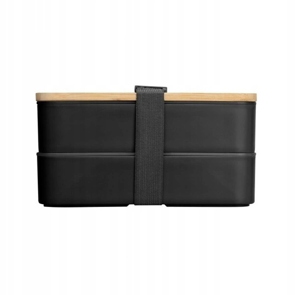 - Śniadaniówka ze szczelną pokrywką. Podwójny pojemnik w kolorze czarnym i sztućce w zestawie: plastikowa łyżka, widelec, nóż oraz pasek zabezpieczający przed otwarciem. Nadaje się do użycia w mikrofalówce. Wymiary: 18cm x 10cm x 9.3cm