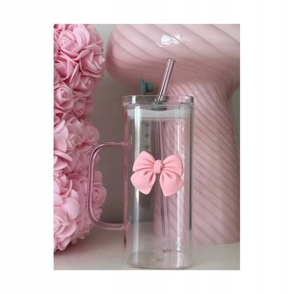 - Szklanka prostokątna z kokardką z przykrywką i słomką 400ml. Wysokość: 14cm. Średnica: 6cm. Wykonana z wysokiej jakości odpornego na uszkodzenia tworzywa sztucznego. Szczelna przykrywka zabezpieczy napój przed wylaniem.