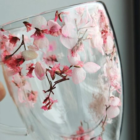 - Szklanka termiczna z podwójnym dnem i płatkami kwiatów w środku. Wykonana ze szkła boro- krzemowego, dzięki czemu jest odporna na uszkodzenia oraz zarysowania. Produkt przeznaczony do ręcznego mycia, nie myj w zmywarce