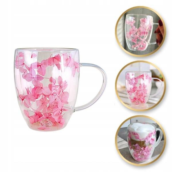ECARLA szklanka termiczna z podwójnym dnem i hortensją w środku Róż SZK77 300ml
