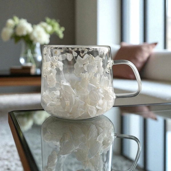 - Szklanka termiczna z podwójnym dnem to wyjątkowy sposób na ciepłe i zimne napoje. Wewnątrz znajduje się piękny motyw hortensji, który dodaje elegancji i oryginalności. Dzięki podwójnym ściankom napój dłużej utrzymuje optymalną temperaturę