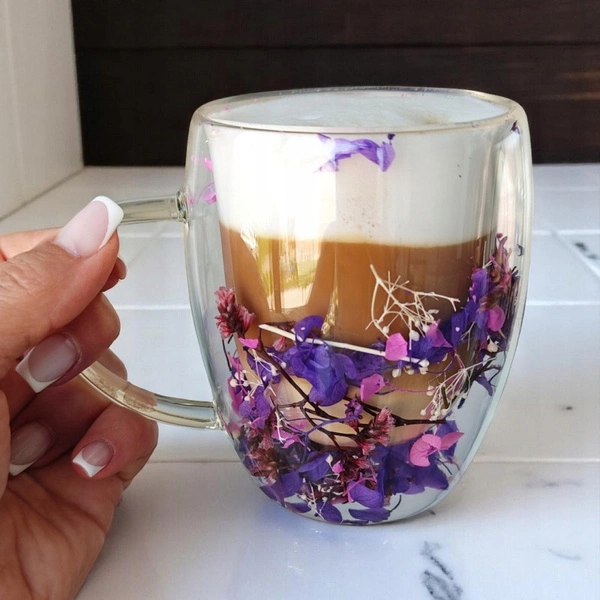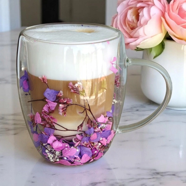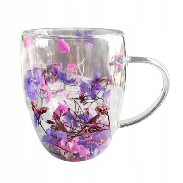 - Szklanka termiczna z podwójnym dnem i płatkami kwiatów w środku. Wykonana ze szkła boro- krzemowego, dzięki czemu jest odporna na uszkodzenia oraz zarysowania. Produkt przeznaczony do ręcznego mycia. Wymiary: Wysokość: 11cm, Śr. wewnętrzna od góry: 8cm.