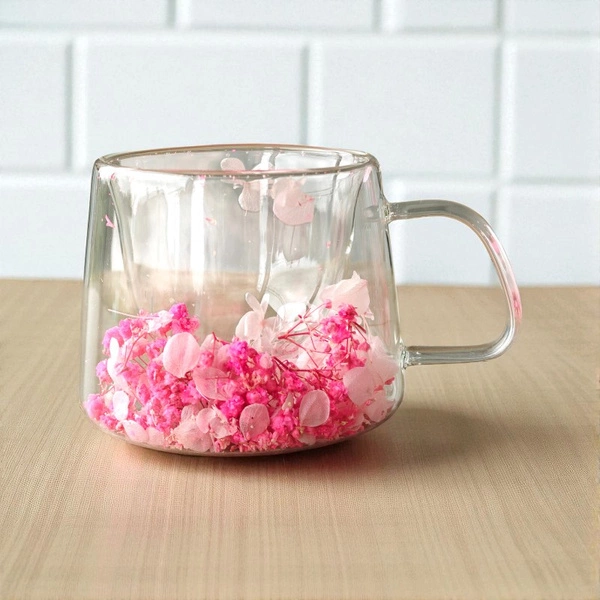 - Szklanka termiczna z podwójnym dnem i płatkami kwiatów w środku. Wykonana ze szkła boro- krzemowego, Produkt przeznaczony do ręcznego mycia. Wymiary: Wysokość: 7,5 cm, Śr. zewnętrzna od góry: 7,5 cm, Śr. zewnętrzna od dołu: 9,5 cm