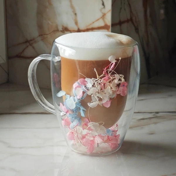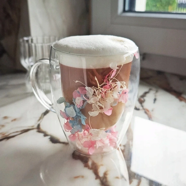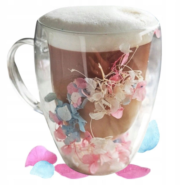 - Szklanka termiczna z podwójnym dnem i płatkami kwiatów w środku. Wykonana ze szkła boro- krzemowego, dzięki czemu jest odporna na uszkodzenia oraz zarysowania. Produkt przeznaczony do ręcznego mycia. Wymiary: Wysokość: 11cm, Śr. wewnętrzna od góry: 8cm.