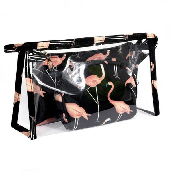 ECARLA zestaw 3 kosmetyczek Czarne w różowe flamingi KS65WZ2