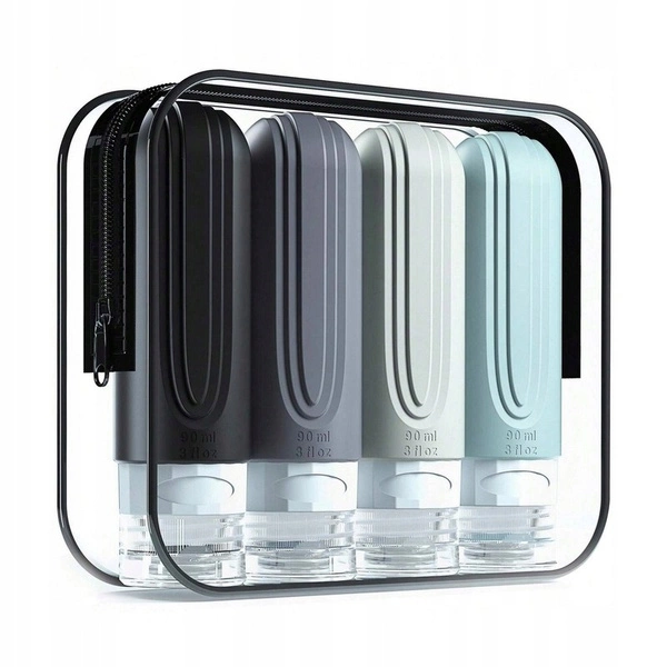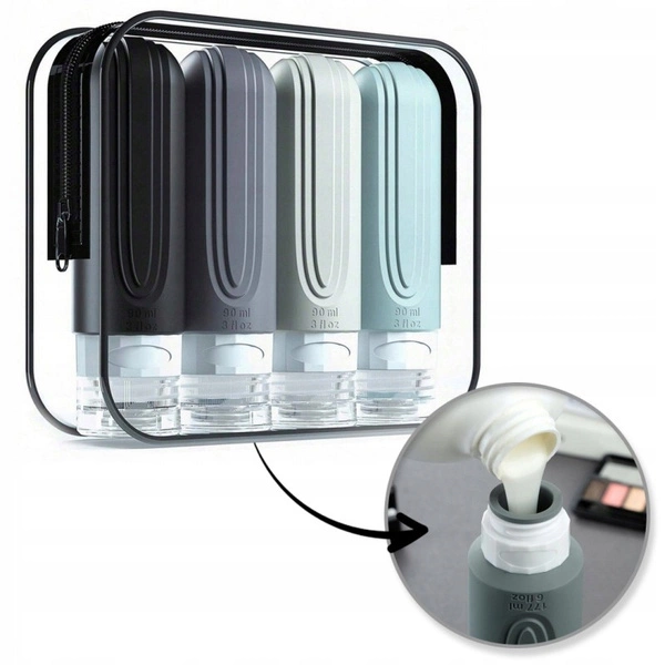 - 4-częściowy zestaw silikonowych buteleczek, specjalnie zaprojektowanych do przewożenia kosmetyków w podróży. Szczelnie zamykane, chronią przed przypadkowym wyciekiem w walizce, czy torbie podróżnej. Wysokość: 13 cm. Pojemność: 90ml