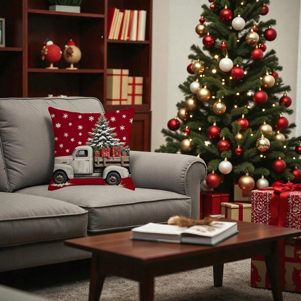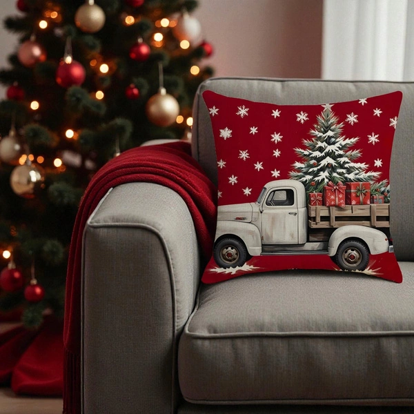ECARLA Zima Świąteczna poszewka na poduszkę Boho 45x45 AUTO Z CHOINKĄ POD246