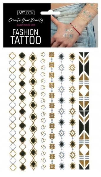 - Tatuaż metaliczny, samoprzylepna, zmywalna ozdoba ciała w stylu biżuterii. Łatwy w aplikacji i bezpieczny dla skóry, idealnie sprawdzi się na lato, festiwale i imprezy. Daje efekt błyszczącego tatuażu – wygląda jak złota lub srebrna ozdoba.