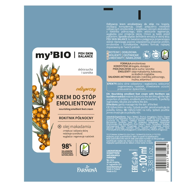FARMONA my'Bio - Odżywczy krem emolientowy do stóp z rokitnikiem północnym, 100 ml