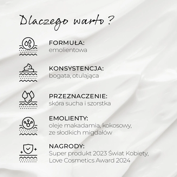 Główne emolienty: olej makadamia, olej kokosowy, olej ze słodkich migdałów