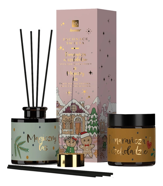 - Dyfuzor o zapachu Pomarańczy w czekoladzie oraz sojowa świeca o aromacie Magicznego lasu powstały z naturalnych olejków eterycznych. Wspaniały aromat dyfuzora wypełni pomieszczenie dzięki długim, naturalnym patyczkom z rattanu.