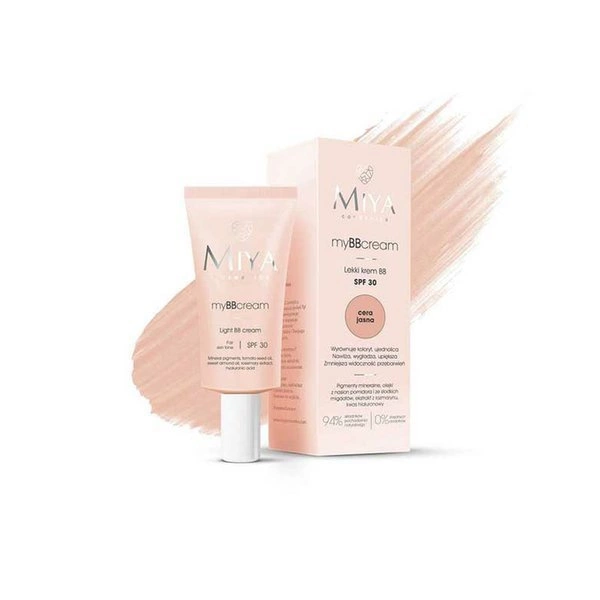 Miya Lekki krem BB SPF30 cera jasna dedykowany jest dla każdego rodzaju skóry o bardzo jasnym kolorze. Posiada doskonałe krycie, nie wysusza skóry, bardzo dobrze chroni przed szkodliwym działaniem promieni słonecznych jak i intensywnie nawilża. Jego lekka konsystencja i składniki w niej zawarte sprawiają, że długo utrzymuje się na twarzy, nie tworzy tzw. efektu maski dając naturalne wykończenie.